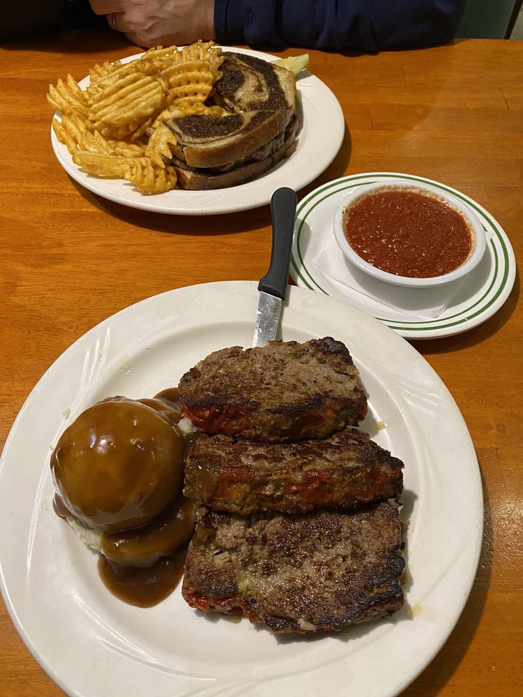 Hamburger patty between American cheese slices on grilled marble rye bread with grilled onions.