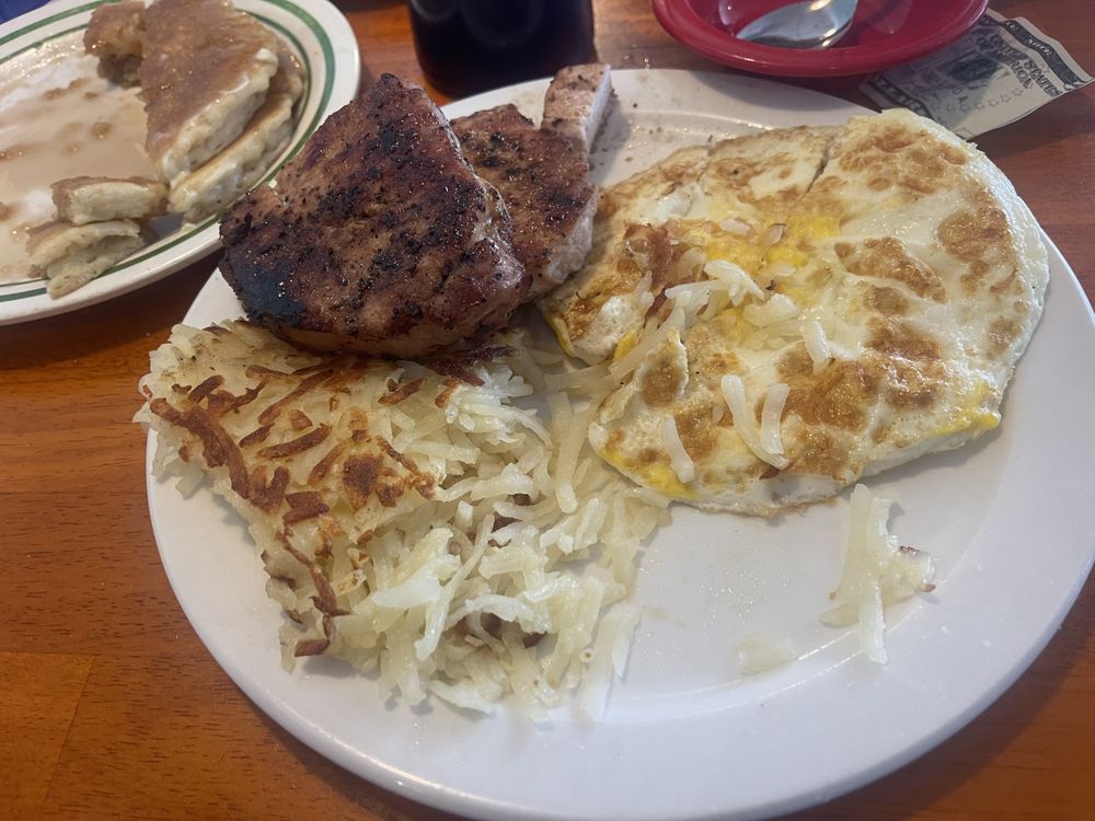 Center-cut boneless pork chops broiled and served with two eggs in any style, hash browns or grits and toast or pancakes.